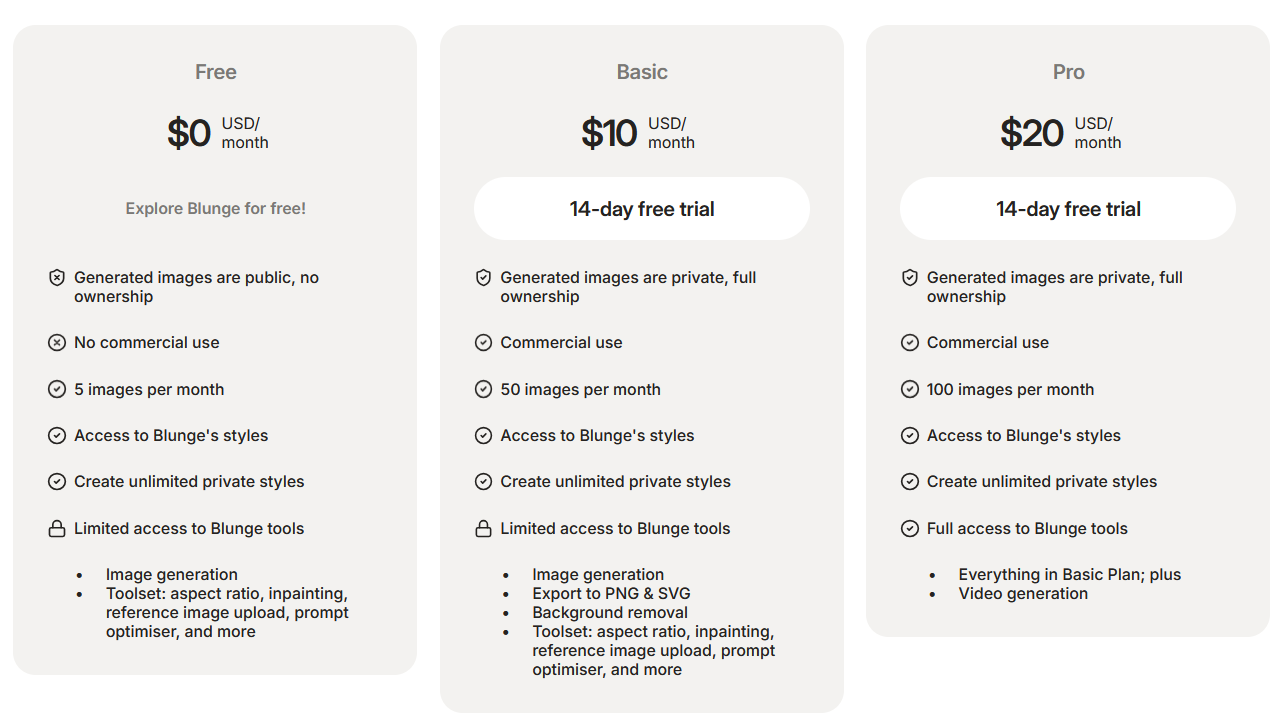 - Ethically-sourced internal datasets: Blunge provides pre-trained models based on open-source and non-copyrighted datasets for users who don't have custom models.