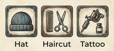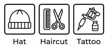 Prompt: “Use the tile images in this version - do not regenerate the tile images - and add the words "Hat", "Haircut", and "Tattoo" in a simple sans serif font, each centered underneath its respective tile.”